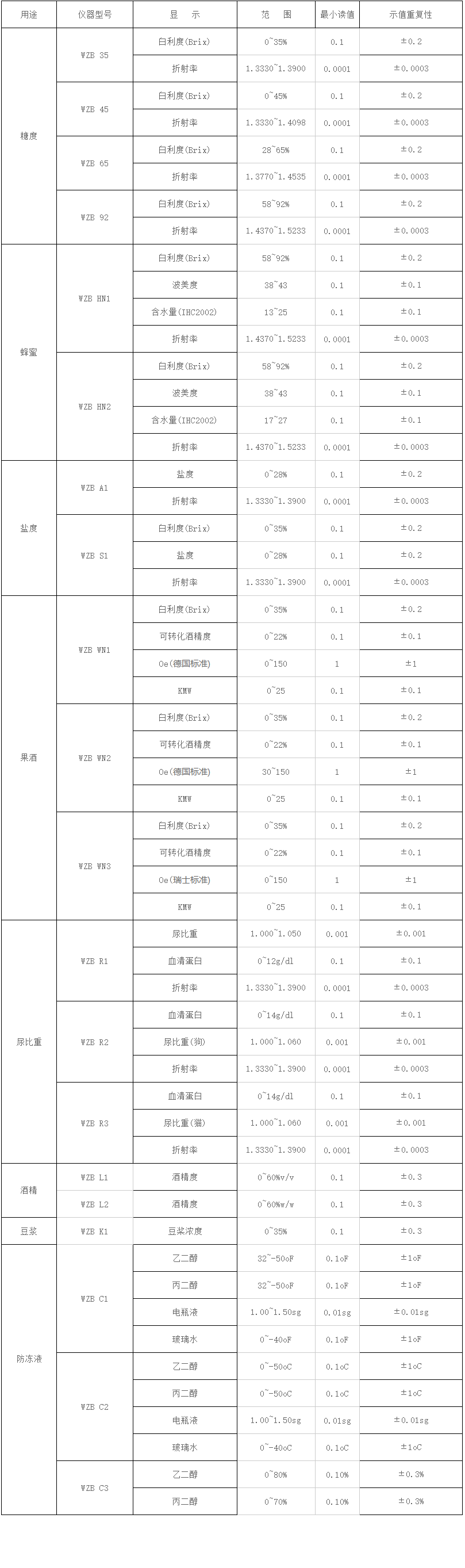 具有自动温度补偿的功能,使用次数达10000次以上,有自动关机的省电功能,温度显示:摄氏/华氏转换,有电量报警功能。系列中不同型号可分别显示被测样品的折射率、白利度(Brix)、糖度、盐度、波美度、可转化酒精度、豆桨浓度、尿比重、血清蛋白浓度、乙二醇浓度、丙二醇浓度、电瓶液浓度等。