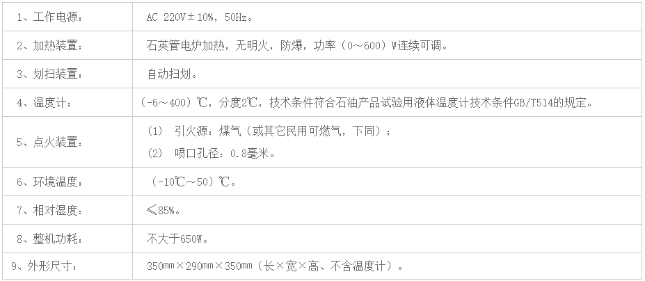 本仪器是于按照中华人民共和国标准GB/T 3536- 2008《石油产品闪点和燃点的测定 克利夫兰开口杯法》所规定的要求设计制造的,适用于测定除燃料油和开口闪点低于79℃外的石油产品和沥青的闪点和燃点。